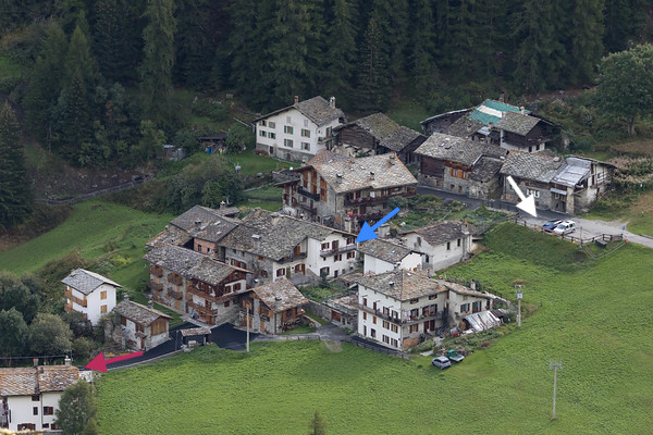 En venant de Turin, prendre la sortie d’autoroute d’Aoste Est et continuer en direction de Courmayeur sur la SS 26. Après le village de Villeneuve, prendre à droite la SR régionale 23 pour Valsavarenche. Bien se trouve un kilomètre et demi après la chef-lieu Degioz, toujours sur la voie régionale, au kilomètre 20ème environ. Un parking est disponible en bas, à l’entrée du village (flèche rouge sur la photo à droite), un autre en haut (flèche blanche), en continuant quelques centaines de mètres et en prenant la petite route sur la gauche. S’il vous plait, ne rentrez pas plus loin dans le village avec la voiture. La maison est accessible en marchant sur un sentier à l’intérieur du village (flèche bleue).